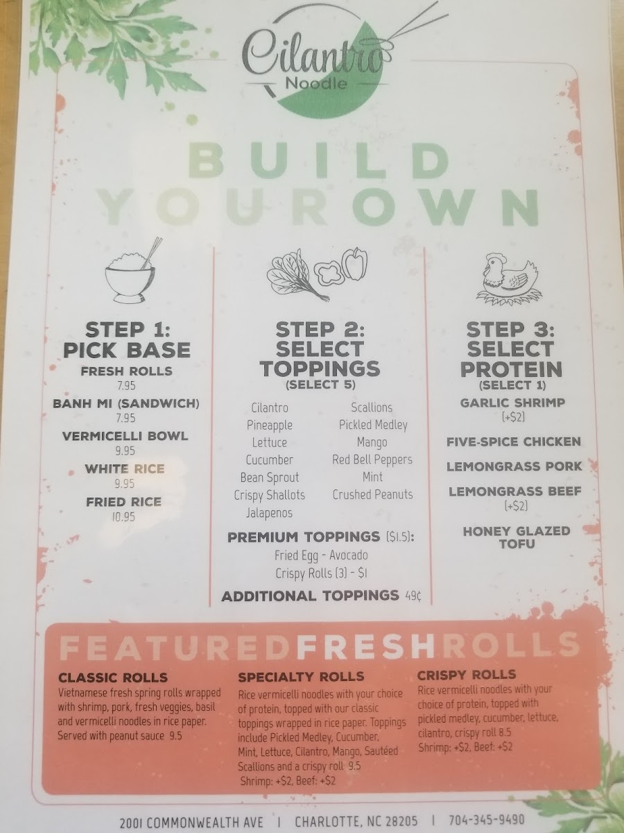 Welcome to Cilantro Noodle, a culinary gem nestled in the bustling Charlotte, NC. Located at 2001 Commonwealth Ave, this vibrant eatery stands out with its inviting atmosphere and a menu that showcases the rich flavors of Asian cuisine. Known for their build-your-own bowls and comforting pho, Cilantro Noodle is a haven for both meat lovers and plant-based eaters alike.